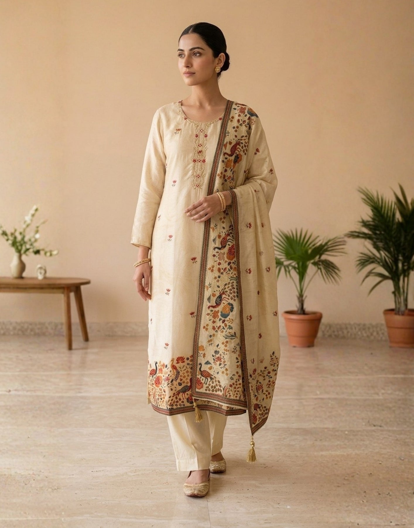 Paired with comfortable straight-fit pants and a coordinated dupatta adorned with detailed prints and tassel accents, this set strikes the perfect balance between timeless tradition and contemporary workwear style.