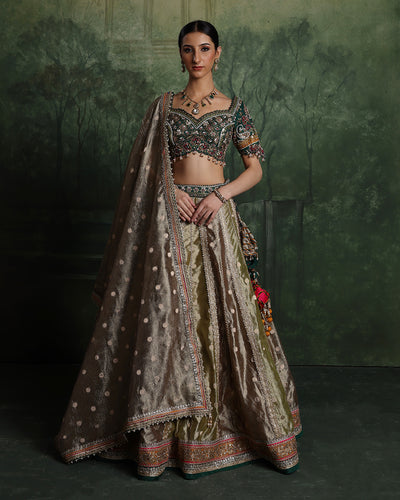 The vibrant Green Banarasi Embellished Lehenga Set, Wild Forest Green Floral Printed Lehenga Set, Spring Bud Embellished Lehenga Set will set the tone for the mehendi celebrations.