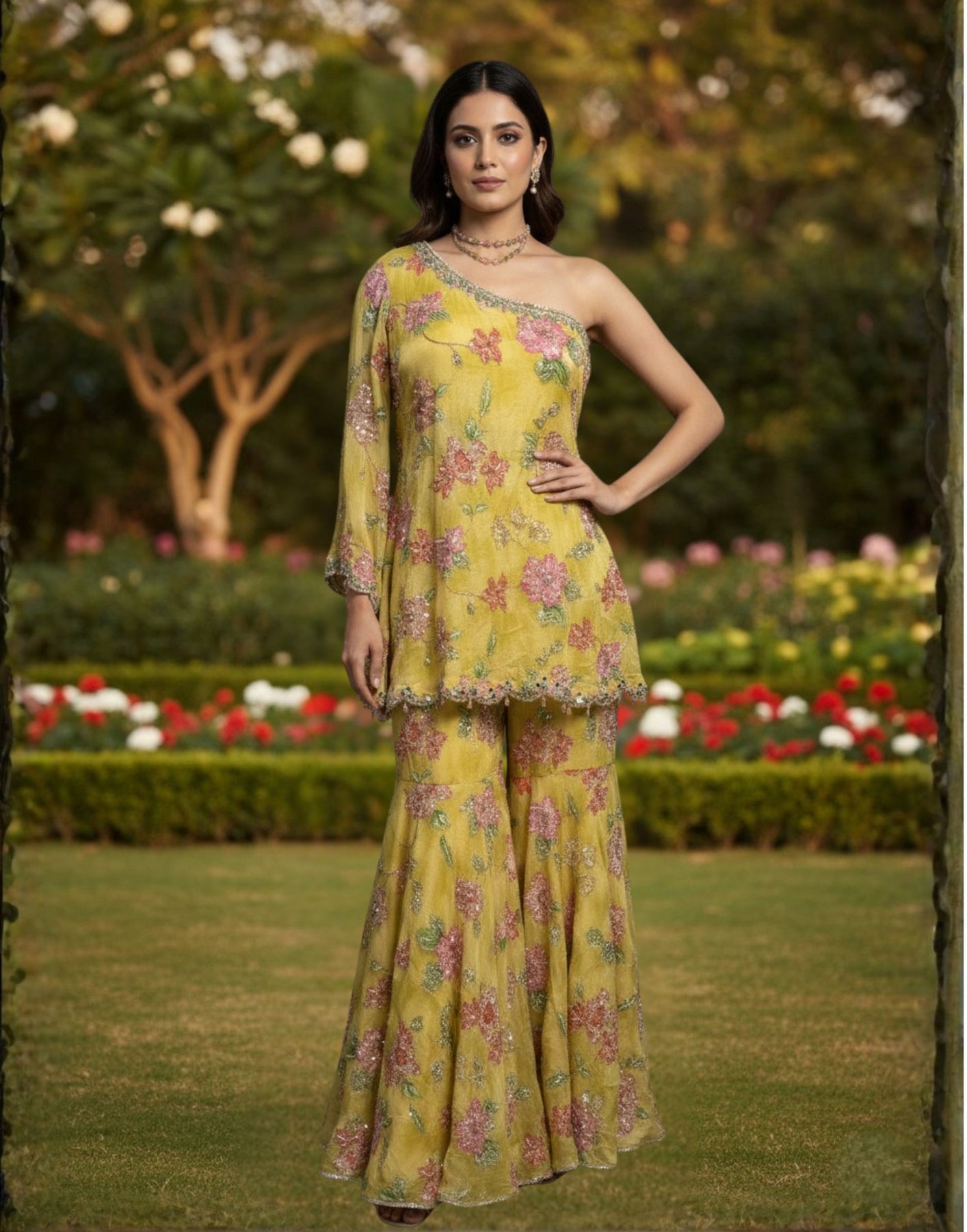 Please dry clean only when applicable. Please keep embroidered outfits in a muslin cloth to avoid damage