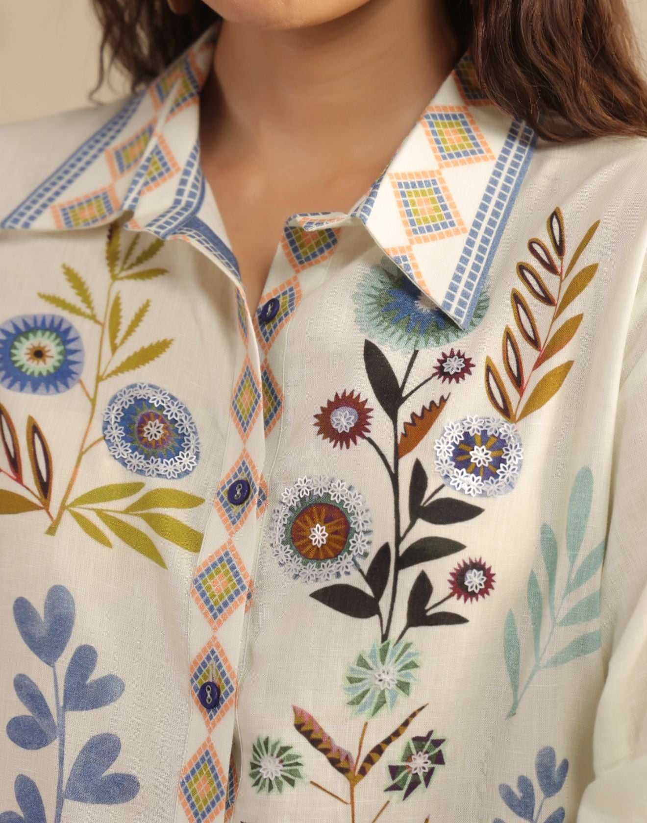 • The set features a collar button-down top adorned with a vibrant mix of floral and geometric prints in multicolor, adding a playful and contemporary charm.